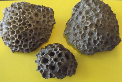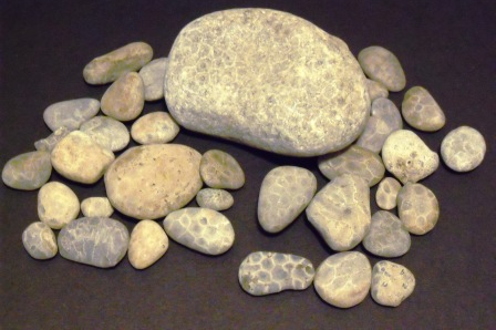Rounded HEXAGONARIA coral as found on the beach near Charlevoix. In many cases it is hard to discern what they are until they are moistened with water to reveal the delicate structure.