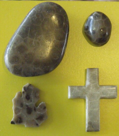 The Hexagonaria are found across the state of Michigan along lakeshores and rivers in sediments commonly called the Traverse group. They are rounded fragments of the coral Hexagonaria. Some of these coral reefs still lie beneath the ground and under the water of Little Traverse Bay. Due to the waves and abrasive action of the sand, these stones are rounded and washed up on the beach. The action of ice also brings these stones into shallow water. The best time to hunt for Petoskey stones is in the spring as soon as the ice melts. I have even seen locals donning wet suits and walking in waste deep water as ice floats by, picking up the stones before they even reach shore.