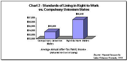 Adjusting for the cost of living, including taxes, families in the 21 right-to-work states earn $2,852 more in real income per year than do their counterparts in Michigan and the other 29 states that lack right-to-work laws (See Chart 2). Between 1960 and1993, the number of manufacturing jobs in the 21 right-to-work states rose by 77 percent, far in excess of the other states. The evidence is clear and compelling: Right-to-work really means the right to work for more-more individual freedom, more jobs, and more income in real terms.