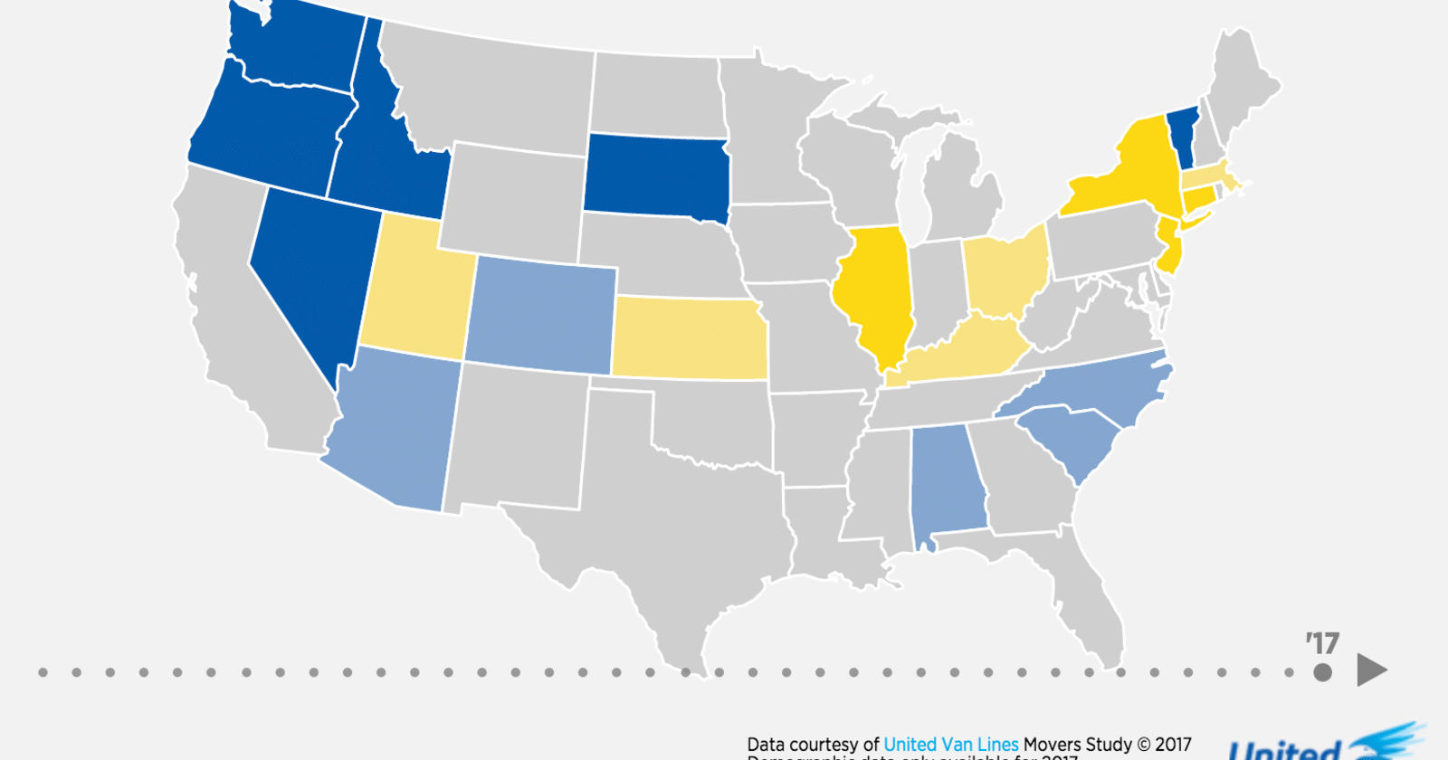 The top five outbound states are Illinois (60.8 percent), New Jersey (60.5 percent), New York (58.3 percent), Michigan (58.0 percent) and West Virginia (56.7 percent). The top five inbound destinations are Washington, D.C., (62.5 percent), Oregon (60.8 percent), Nevada (56.9 percent), North Carolina (56.4 percent) and Florida (55.1 percent).