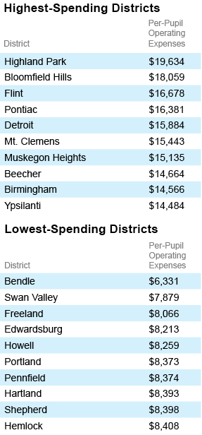 Here are the top 10 highest and lowest spending districts (with more than 1,000 students) in per-pupil terms from 2011: