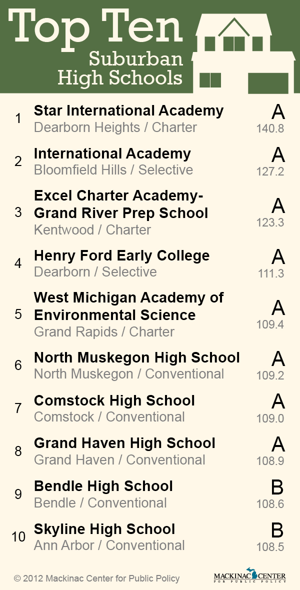 Our new "Context and Peformance" Report Card factors student poverty levels into four years of standardized test scores for nearly 600 public high schools in Michigan and ranks the schools accordingly. Here's a list of the top 10 suburban high schools.