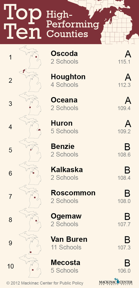 Below is a list of the top 10 Michigan counties with the highest-scoring high schools. In order to avoid having counties with a single high school skew the results, counties with only one high school were not included in this list.