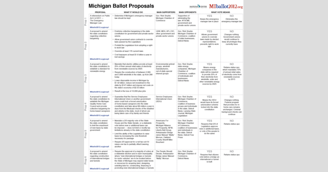 The nearby chart will help voters sort through the proposals to see who supports and who opposes them as well as what they would mean for Michigan (to get a pdf version of the chart, click here).