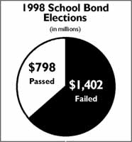 Unfortunately, taxpayers just arent biting. In 1998 there were 107 school bond proposals on ballots across the state requesting more than $2.2 billion in new revenue. Less than 37% of these passed, raising only $798 million.