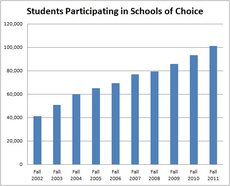 During the 2011-12 school year, more than 100,000 students attended a school outside of their resident school district, thanks to the state's Schools of Choice program. As the chart above shows, this number has more than doubled since fall 2002. Moreover, many other students may not be participating because several school districts are actively prohibiting nonresident students from attending their schools.