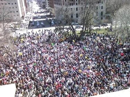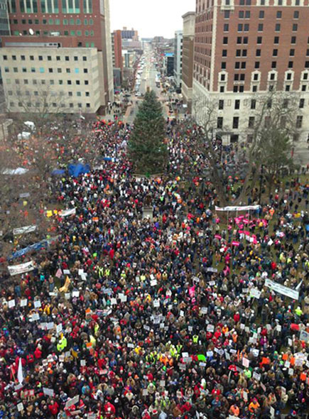 So were the union protest numbers juiced-up? You decide. Below is a photo taken from the fourth floor of the Capitol building at 10:05 a.m. on Dec. 11, 2012, during the protest against worker freedom. The crowd size increased somewhat over the next hour, but not dramatically so. Starting around noon hundreds of people were seen streaming away from the Capitol (it was cold).