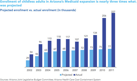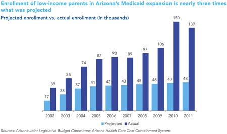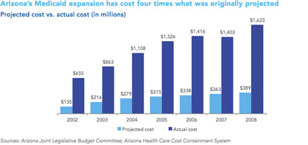 One of the past expansions the Foundation for Government Accountability report examines occurred in Arizona. The report includes these charts (plus many others) showing the original projections vs. what really happened: