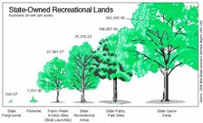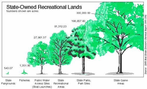 If the state sold off the 590,000 acres (14,312) lots that comprise recreational or recreation-related lands at the per-lot sales price mentioned above, the it could raise more than $18 million in new revenue. Recreational land may include gaming areas, state parks, hatcheries, fairgrounds, and water access sites as highlighted in the DNR's biennial real estate report. MPR includes hatcheries in the "recreation" category because of its relationship to sport fishing, and the fact that these institutions could be privatized.