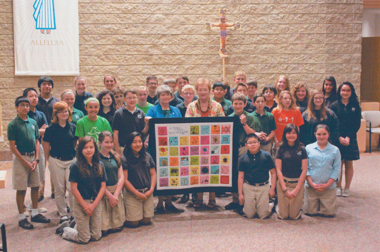 As the capstone of their unit of study, the students traveled to the Holocaust Memorial Center in Farmington Hills, Mich. They found a memorial quilt on display there and they were excited to find a quilt square honoring Sir Nicholas Winton and his efforts for the children of Prague. The students were so taken with the idea they decided to create their own memorial quilt to hang forever in the halls of Corpus Christi.