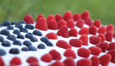 4. Rinse berries; pat dry with paper towels. In upper left corner, arrange blueberries in 5 inch square to make blue field of flag. Starting and ending at edges of cake, arrange 7 horizontal rows of raspberries, leaving white stripes between red stripes. Store in refrigerator.