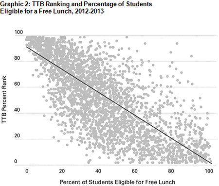 For the 2012-2013 school year, 55 percent of the variation in TTB scores for schools could be explained by the percentage of students eligible for free lunch at each school.[†] This has been consistent across years — this same figure was 56 percent the previous school year. Interestingly, the correlation between a school’s TTB rank and student poverty is similar in value to the correlation between raw standardized test scores and student poverty.[28] In other words, the formula used for the TTB list does not appear to mitigate the fact that schools serving larger portions of low-income students will generate lower standardized test scores on average.