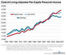 In any case, accounting for the cost of living in every state shows that right-to-work states have 4.1 percent higher incomes than non-right-to-work states. Right-to-work states also have 14 percent higher incomes adjusted for cost of living than Michigan.