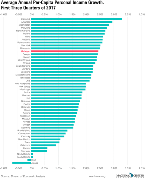 The first three quarters of 2017 saw per capita personal incomes increased by 2.4 percent over the previous year. That is higher than the 2.1 percent national average and 12th-highest among the states. And it is a good indicator that Michigan residents are more prosperous.
