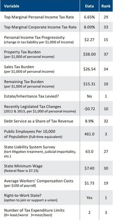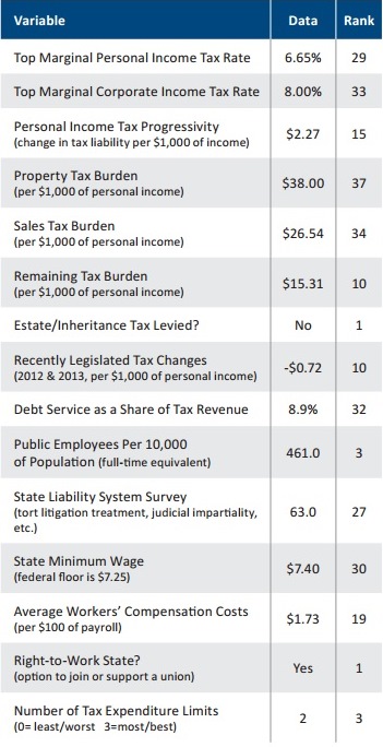 The index is created from 15 variables that the authors believe contribute to a states’ economic well-being: marginal personal tax rates; marginal corporate tax rates; personal income tax progressivity; property tax burden; sales tax burden; remaining tax burden; estate tax levy (if any); recent tax changes; debt service as a share of tax revenue; public employees per 10,000 of state population; the state’s liability system; state minimum wages; average worker’s compensation costs; whether or not a state has a right-to-work law and whether or not a state maintains expenditure limits like the Headlee Amendment.