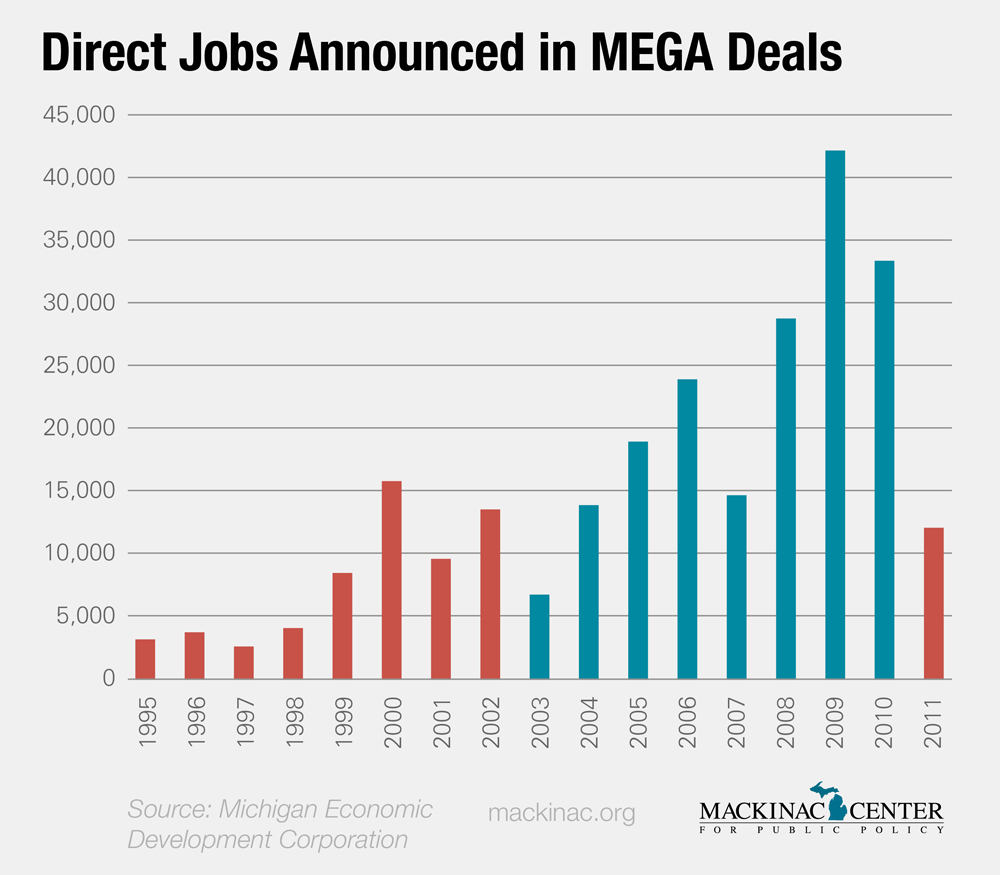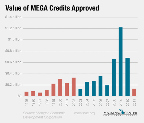 The Michigan Economic Growth Authority was considered the state’s flagship economic development program in the 2000s. Launched by Gov. John Engler in 1995. It granted “refundable” tax credits to particular firms selected by political appointees on the entity’s board. (MEGA was replaced in 2011 by a direct subsidy program, with amounts appropriated annually by the Legislature.)