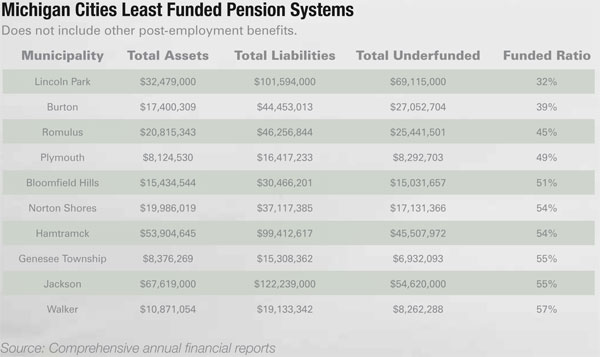 Of the cities with the worst funded ratio, some have taken decisive action. The cities of Walker, in West Michigan, and Plymouth, in Wayne County, have shifted new employees to 401k-type accounts. These defined contribution accounts put a floor on the underfunding and a cap on politicians racking up future liabilities.