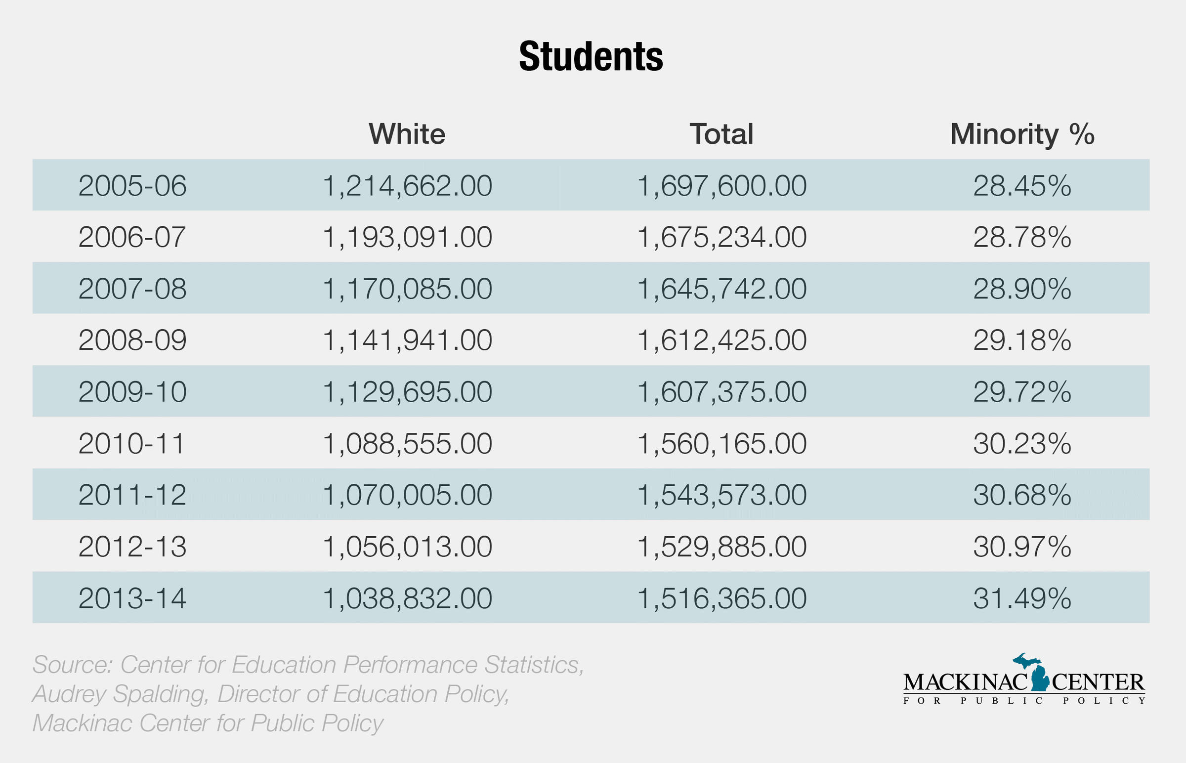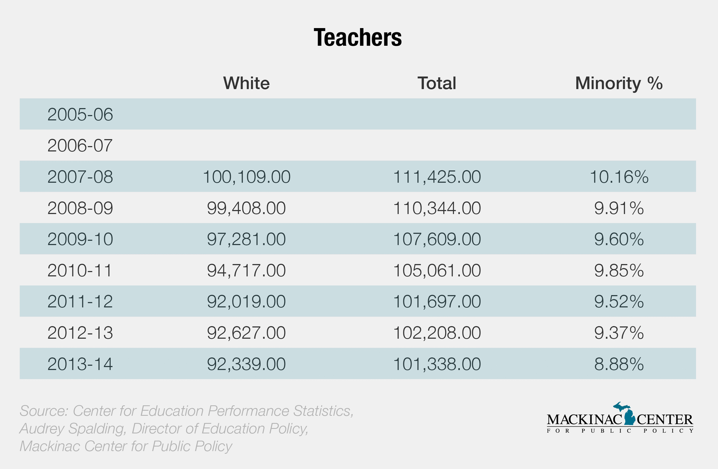 Data from the state’s Center for Educational Performance and Information at least suggests the program hasn’t worked. If the program really is designed to increase the percentage of minority teachers in Michigan, then it has been a failure. According to CEPI, the percentage of minority teachers in Michigan has actually dropped from 10.2 percent of all teachers in 2007 to 8.9 percent in 2013. During the same period, enrollment of minority students has increased from 28.9 percent all of all students 31.7 percent.