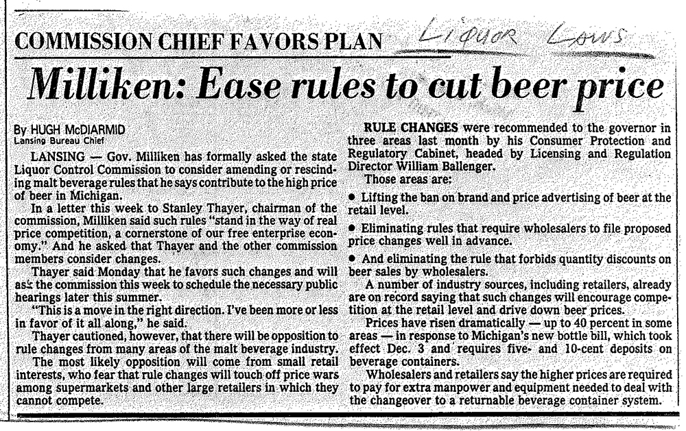 These are archaic rules that reward more than 60 beer and wine wholesale businesses in Michigan at considerable expense to consumers. They should be repealed and the sooner the better.