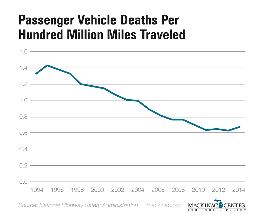 The highway safety office reports that vehicle accidents are at all-time lows. There were 289,061 crashes in Michigan in 2013, when drivers traveled 95 billion miles on Michigan roads. Thus, there were three crashes per million miles traveled. Ten years ago, it was 3.9 crashes per million. Ten years before that it was 4.2 crashes per million. Ten years before that it was 4.7 crashes per million. Before that, it was even worse. (See the chart below.)