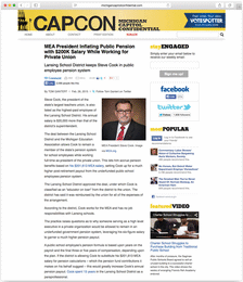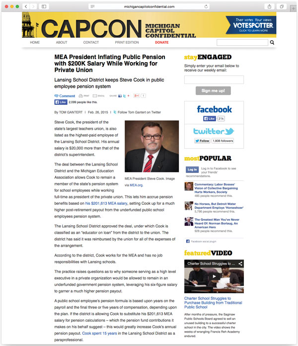 On March 5, WLNS 6 News covered a story titled “Retirement Pension Deal Stirs Controversy In Lansing.” Two weeks later, The Detroit News ran a story about Cook’s pension titled, “MEA boss scores hefty state pension.”