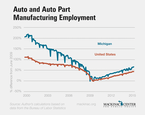 Auto industry jobs rebounded even more. Jobs in auto and auto-part manufacturing are up 67 percent from their recessionary trough. Yet, compared to their peak in 2000, the state has fewer than half of the auto and auto-parts manufacturing jobs than it did 15 years ago.
