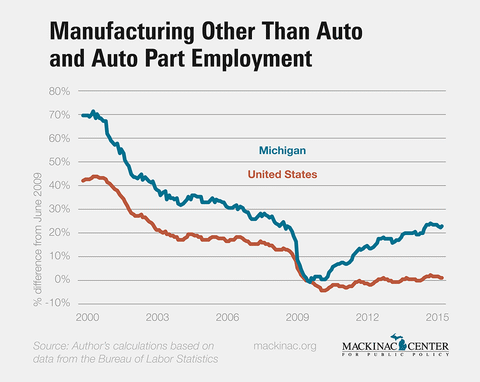 Michigan produces other things than cars and trucks. And this is where Michigan has seen some unexpected growth. Non-auto manufacturing jobs in Michigan have fully rebounded from the recession, bucking national trends. Nationally, these jobs have stayed at their ratcheted-down levels since the recession.