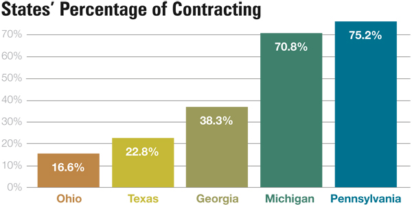 Michigan school transportation, food service and custodial service contracting rates are 26.6 percent, 42.8 percent and 52.2 percent of all districts, respectively. In Ohio, only 6.5 percent of school districts contract out for transportation services, 10.7 percent contract out for food services and 4.2 percent contract out for custodial services. While Ohio has the lowest overall rates of contracting, they do not have the lowest rates in every category. That distinction goes to Georgia.