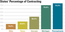 That honor goes to Pennsylvania, with a contracting rate of 75.2 percent statewide. The reason Pennsylvania’s rate is so high is that districts are very comfortable with bus contracting. A survey-leading 66.4 percent of all districts in the Keystone State contract out for busing. More than 44.0 percent of districts in the state contract out for custodial work and 9.0 percent contract out for food services.