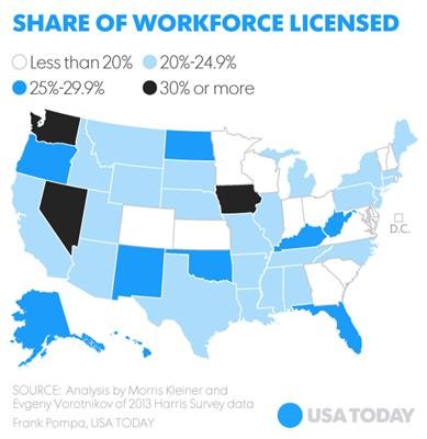 USA Today reports on the growing consensus across the political spectrum — from the Obama administration to the Koch brothers — that many occupational licensing laws are unnecessary obstacles to employment and do not provide any real benefit to public safety.