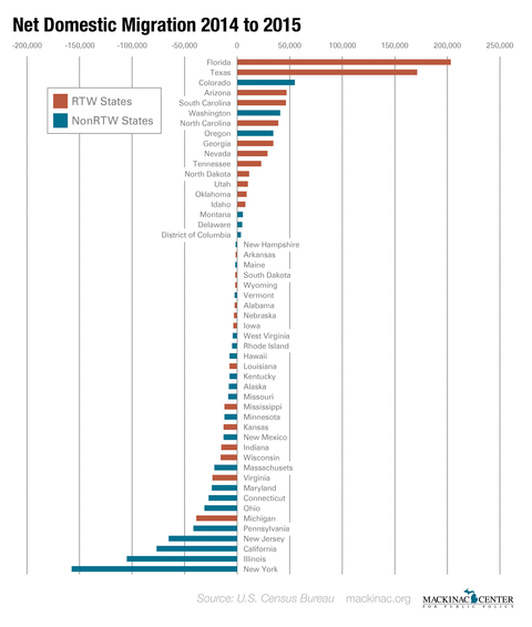 According to the Census Bureau, states with right-to-work laws gained a net 480,411 people who moved from non-right-to-work states between July 1, 2014, and July 1, 2015. Granted, few people move to a state specifically because it enjoys right-to-work protections. They do, however, move to states with greater economic opportunities, something which is facilitated by right-to-work statutes.