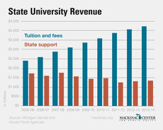 As state support dropped from $1.7 billion to $1.3 billion over the period — a 23 percent decrease — revenues from tuition and fees increased from $2.4 billion to $4.2 billion — a 77 percent increase.