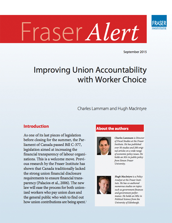The report, “Improving Union Accountability with Worker Choice,” highlights two ways that Canadian policymakers can advance worker freedom. The first, ensuring union transparency, is the subject of the Mackinac Center’s publication, “Bringing Financial Transparency to Michigan's Public Sector Unions.” That June 2015 report by Nathan Mehrens recommends making Michigan’s government unions subject to the same disclosure requirements that private sector unions face.