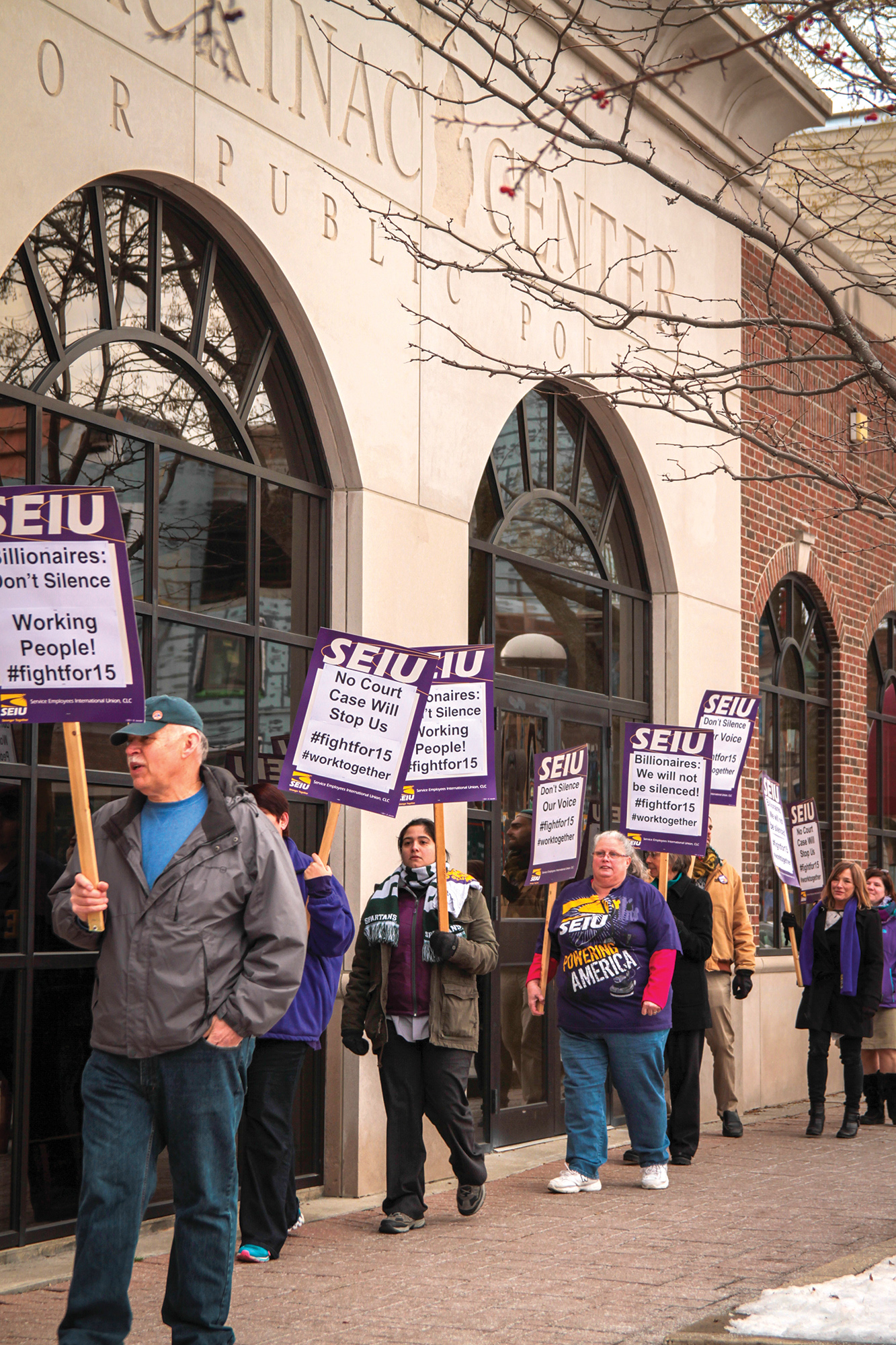 About 10 people paced the sidewalk outside the Mackinac Center’s Main Street entrance in downtown Midland for just under an hour. Most of the signs urged raising the minimum wage to $15 an hour and said nothing of Friedrichs, unionism, or the Center.