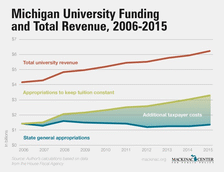 Ten years ago, public universities in Michigan received $1.7 billion in state funds, adjusted for inflation, and average tuition was $6,890. Despite the fact that taxpayers are still spending $1.3 billion a year on universities, the average undergraduate tuition is $11,866, according to Hohman and Skorup.