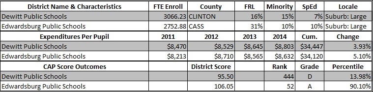 Both DeWitt and Edwardsburg qualify as “exemplary” under this model, yet both also stand among the state’s lowest-spending districts. Edwardsburg performs significantly better given the odds brought by its student body but continues to spend slightly less: $8,811 per pupil in 2014-15, compared to DeWitt’s $9,136.