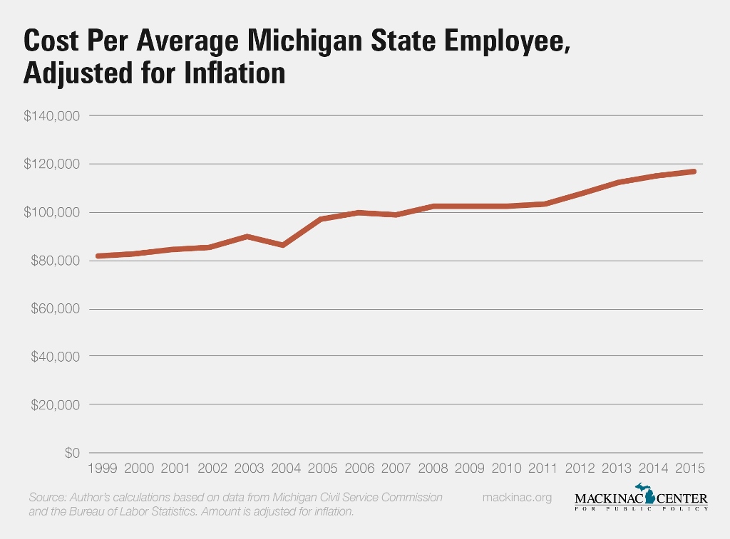 In addition to those complicating factors, just counting how many people get a government paycheck also says little about the actual costs of government services. State employment has been declining for decades, for instance, yet the costs of the state’s employees keep increasing. The state's workforce dropped 25 percent from 2001 to 2015 — from 62,057 full-time equivalent employees to 46,588 — while the costs of state employees actually increased from $3.9 billion to $5.4 billion, growth that even outpaced inflation.