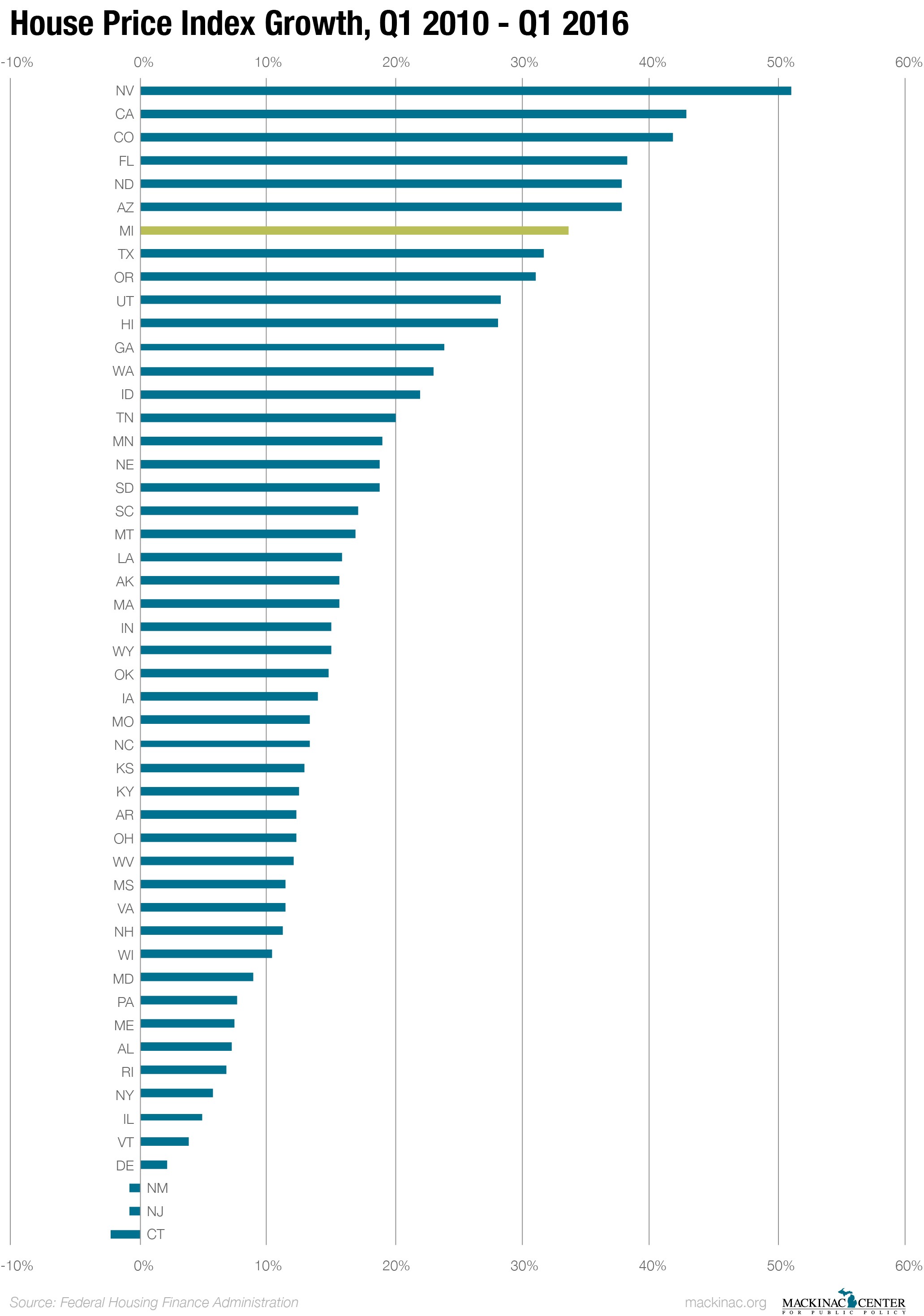 Other state housing value indicators are up as well. The federal Housing Finance Authority’s house price index says that Michigan’s values increased 33.6 percent from the first quarter of 2010 to the first quarter of 2016. That’s the seventh-highest increase among the states.