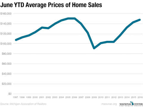 Housing prices in Michigan have recovered from the Great Recession. The price of the average home sale in Michigan in the first six months of 2016 was $147,323. This is the highest since 2006, and approaching record levels.