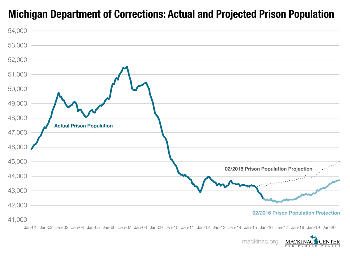 The Department of Corrections attributes the prisoner population decline to decreases in felony court sentences and, therefore, fewer prison admissions. It reports that 2015 was the third year in a row in which prison intake declined, especially among prisoners incarcerated for new crimes.
