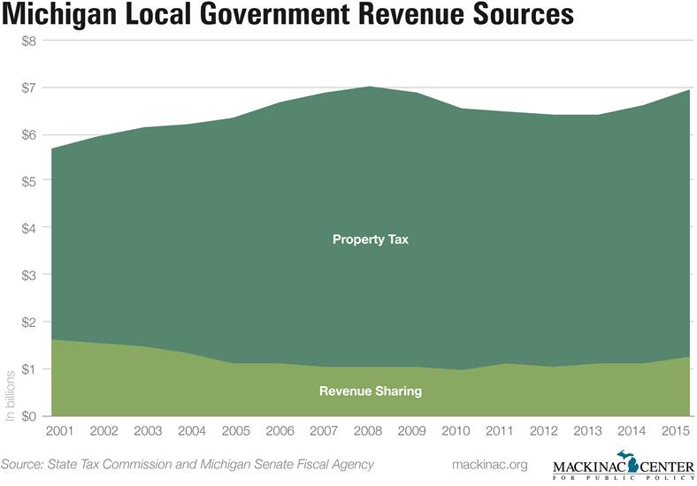 From 2001 to 2008, combined revenue sharing and local government property tax revenue increased by $1.2 billion, a 21.4 percent gain. Property taxes increased by $1.7 billion but revenue sharing dropped by $479 million.