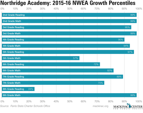 Every other year the Mackinac Center releases a report card that grades the state’s elementary and middle schools based on multiple years of achievement, adjusted to compare with expectations based on the share of low-income students schools serve. Northridge Academy ascended from a middle-of-the-road C in 2013 to an A grade and the top 5 percent statewide on the most recent edition.