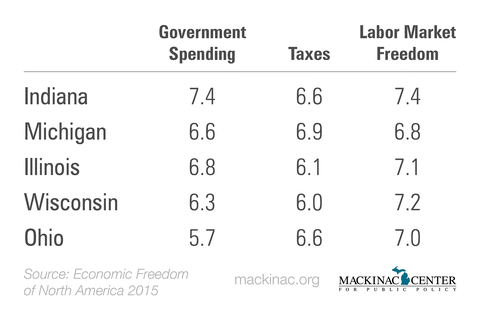 According to the 2015 Economic Freedom Index of North America (which uses data through 2013), Michigan scored a 6.6 out of 10 in government spending, a 6.9 for its tax policies and a 6.8 in labor market freedom.