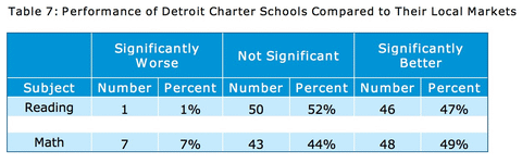 As the table shows, it’s true that half the charters in Detroit are doing “only as well, or worse than” district-run schools in the city. By lumping together the charters that are doing about the same and those that are doing worse, Zernike masks the inconvenient truth that only one charter in Detroit performed worse in reading and only seven performed worse in math.