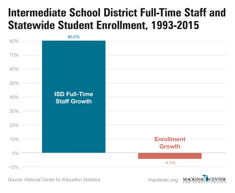 And ISDs need to become more efficient. The long-term trend of a hiring spree among ISDs continues. According to the U.S. Department of Education’s National Center for Education Statistics, since 1993, the number of full-time ISD staff in Michigan has grown by 80 percent, from about 9,300 to 16,700. Over that same time frame, statewide student enrollment has fallen 4 percent, from 1.6 to 1.54 million. There used to be one ISD staffer for every 173 students in Michigan — now there’s one for every 92.