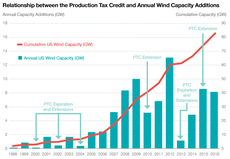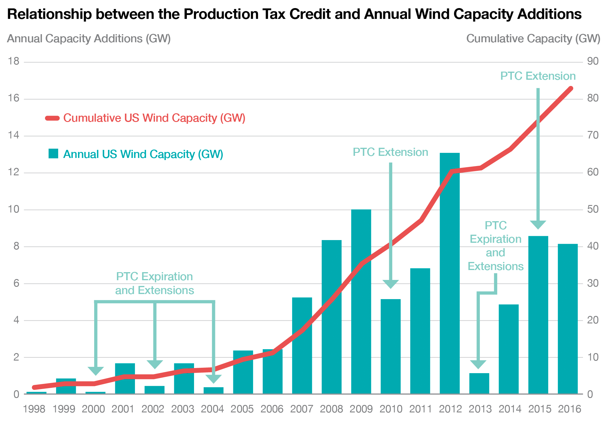 After all that, there still are lavish federal government handouts like the production tax credit, which gives wind developers a subsidy amounting to almost 70 percent of the 2016 wholesale price of electricity in the Midwest. Although the industry tries to deny it, it is dependent on this tax credit, and the construction of new wind generation has always been tied to its existence. When political maneuvering allows the credit to wane or decrease, wind construction plummets. When Congress renews the subsidy, construction resumes.