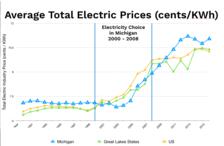 Only 10 percent of retail markets were allowed to remain in the choice market, and that market was almost immediately snapped up by public schools and industrial demand, meaning that no residential customers in Michigan actually have choice. That lack of choice continues to plague our markets today because the Legislature has frequently opted to defer action. For example, in December 2016, Michigan passed Public Acts 341 and 342, which updated state electricity laws. A key argument behind the passage of these bills was that they were needed to maintain an affordable and reliable electrical grid in the state. Michigan’s limited electricity choice market was, at least momentarily, protected in Michigan after a great deal of effort on the part of electricity choice’s defenders.
