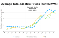 But, as the graph of average total electric prices shows, Michigan’s electricity rates, whether residential, commercial or industrial, are consistently higher than rates in either adjacent Great Lakes states, or across the nation. When we had electricity choice from 2000 to 2008, however, our rates were largely below those seen in Great Lakes states, or across the nation.