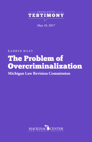 During my comments, I’ll be addressing the problem of overcriminalization in Michigan. The term “overcriminalization” refers to the massive size of the Michigan penal code and the large number of administrative laws and regulations that carry criminal penalties.
