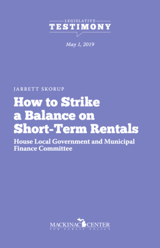 The following is testimony submitted for presentation to the House Local Government and Municipal Finance Committee by the Mackinac Center’s Jarrett Skorup on May 1, 2019.